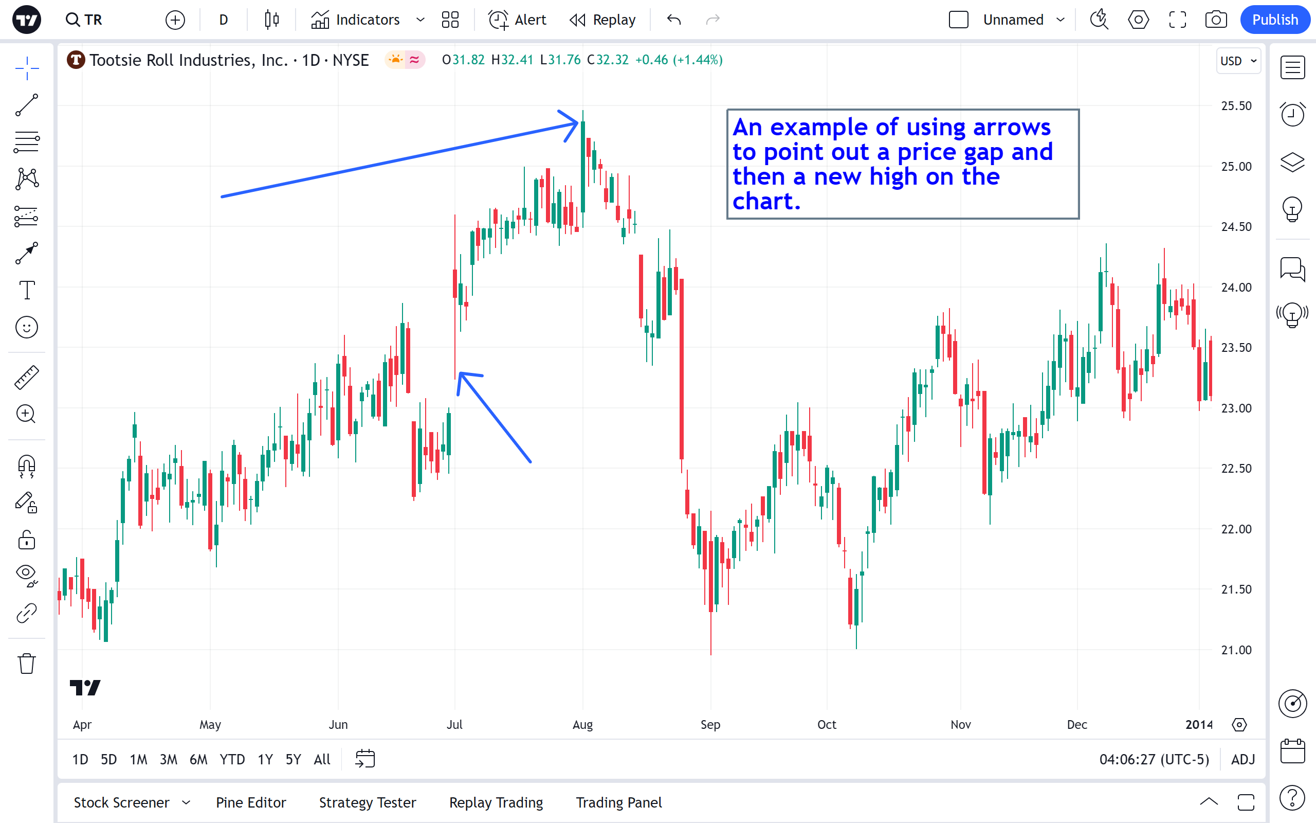 A ferramenta de desenho de setas é usada simplesmente para indicar elementos do gráfico, normalmente ou movimentos de preços, ou movimentos do indicador/estudo.