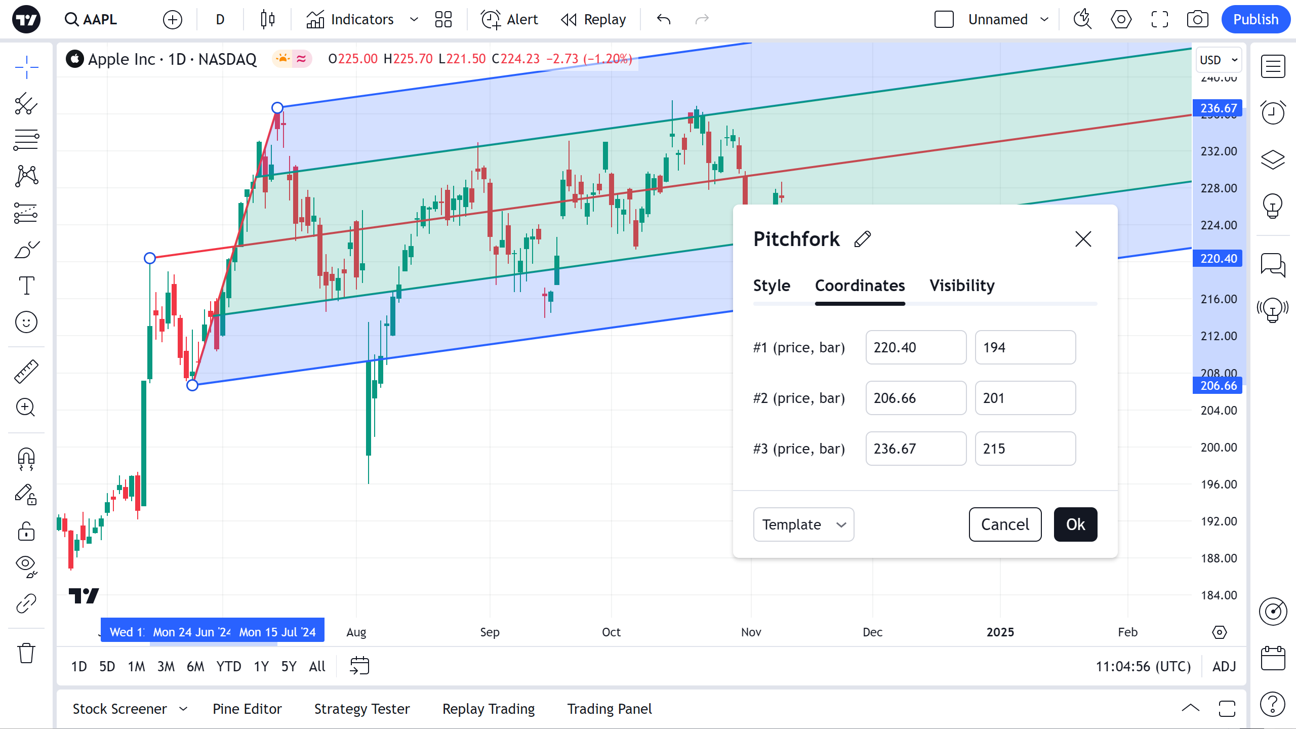 Na caixa de diálogo em Coordenadas, você pode definir com precisão a posição dos pontos finais do Pitchfork na escala de preços (definindo o preço) e na escala de tempo (definindo o número da barra):