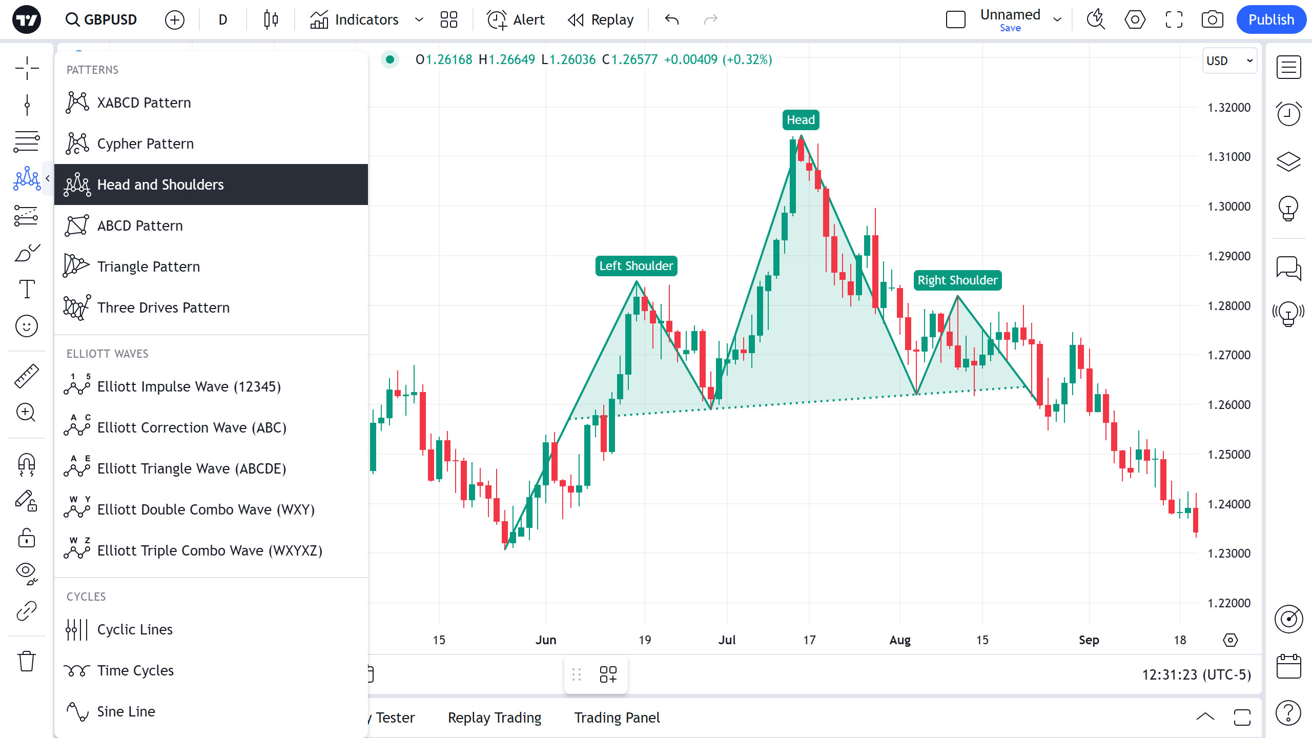 - Ombro Direito: O ombro direito então começa a formação após a Cabeça e o vale resultante. O ombro direito em geral é formado em volume menor do que o ombro esquerdo e a cabeça. O aspecto principal do ombro direito é que seu pico deve ser mais baixo do que o pico da cabeça.