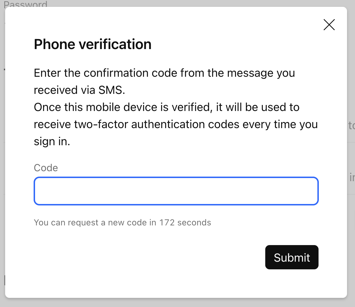 - Receber um código via SMS — uma mensagem será enviada para o número de telefone vinculado à sua conta