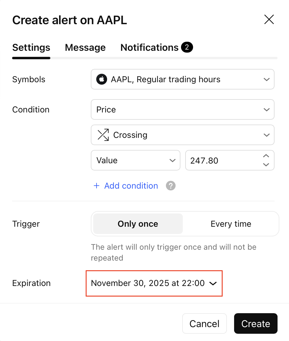 - A opção nunca expira não está disponível para alertas criados em listas de observação.
