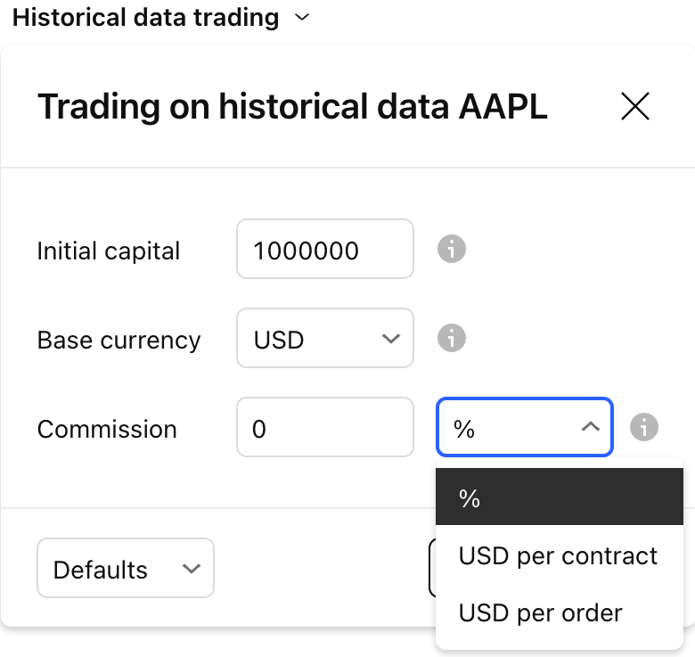 Antes de pressionar o botão Play, você também pode definir o capital inicial, a moeda de base e o tamanho da comissão por meio dos menus apropriados no painel Replay de Negociação. Essas configurações afetarão sua sessão de negociação, portanto, é importante defini-las de acordo com suas necessidades.