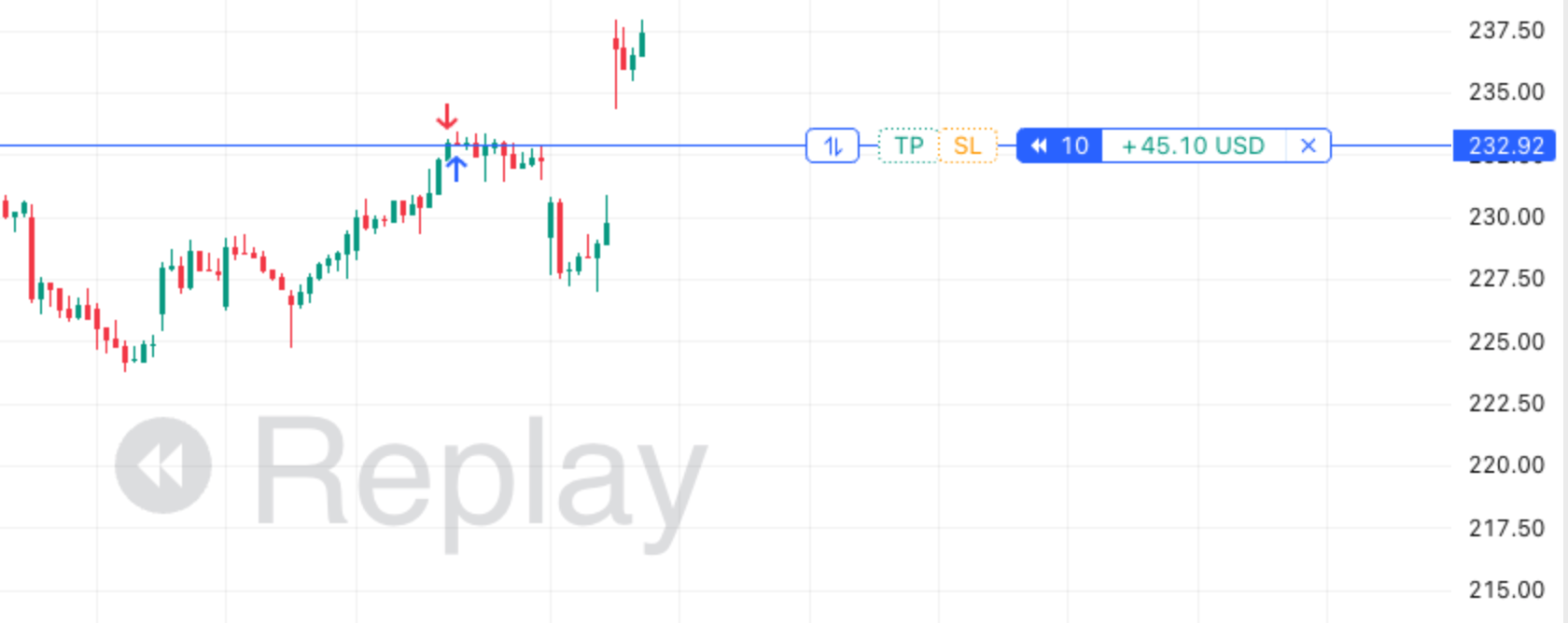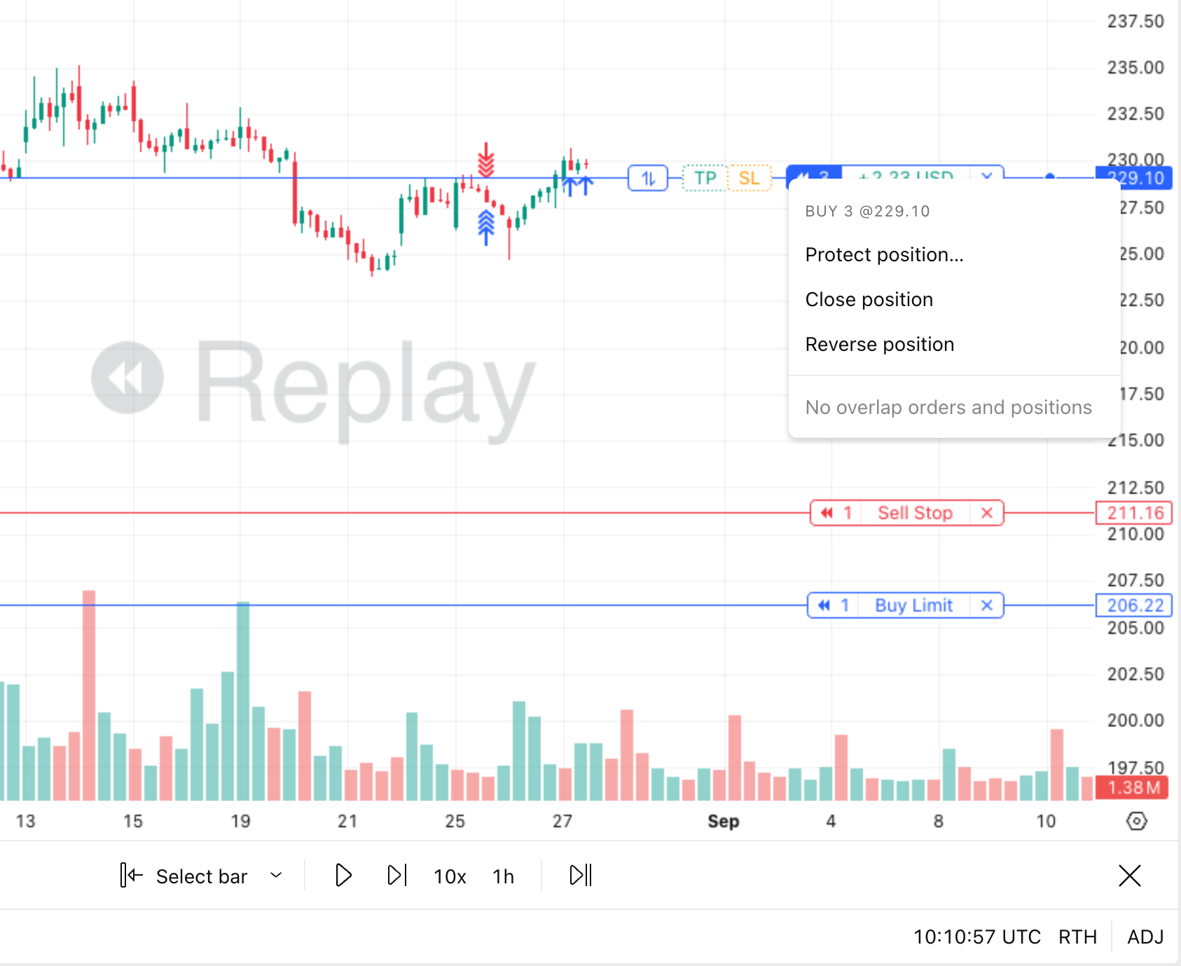 A negociação com base em dados históricos está disponível imediatamente após selecionar o ponto de partida. Você pode abrir posições e colocar ordens limite, stop e stop-limite, assim como faria em uma corretora real. Para negociar, use os botões Comprar e Vender no canto superior esquerdo do gráfico, o menu mais no gráfico ou o Ticket de Ordem, que você pode abrir clicando em Negociar.