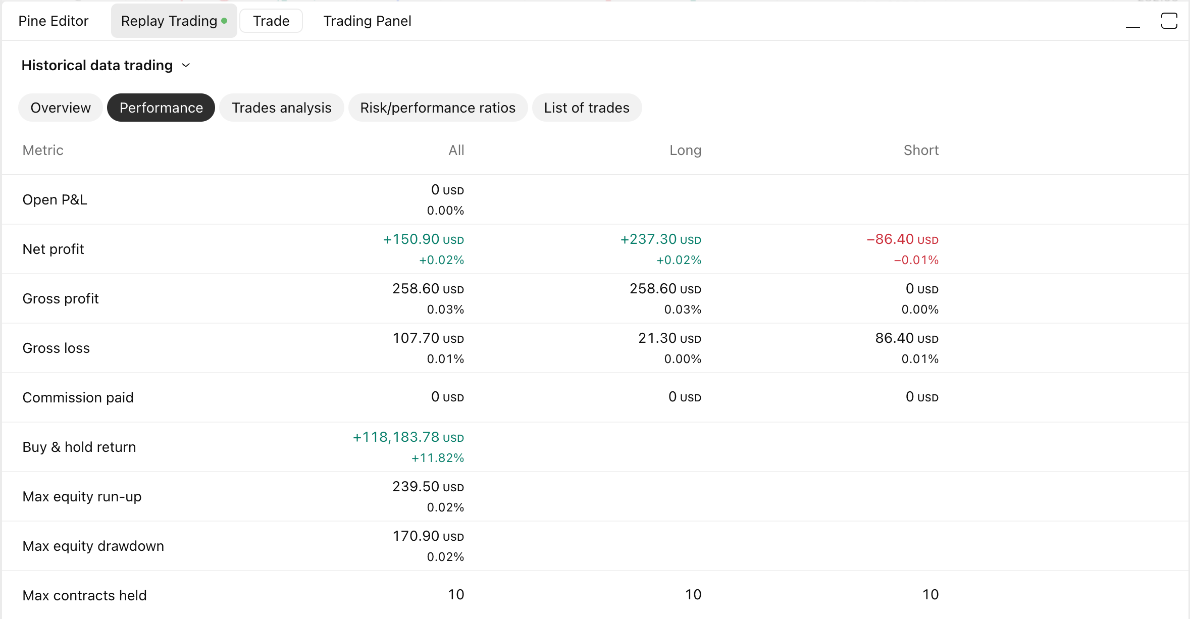 Para obter mais estatísticas de negociação, verifique as abas Visão geral, Resumo do Desempenho e Lista de negociações no painel Replay Trading. O Resumo do Desempenho e a Lista de Negociações também podem ser exportados para análise posterior ou guarda os registros.