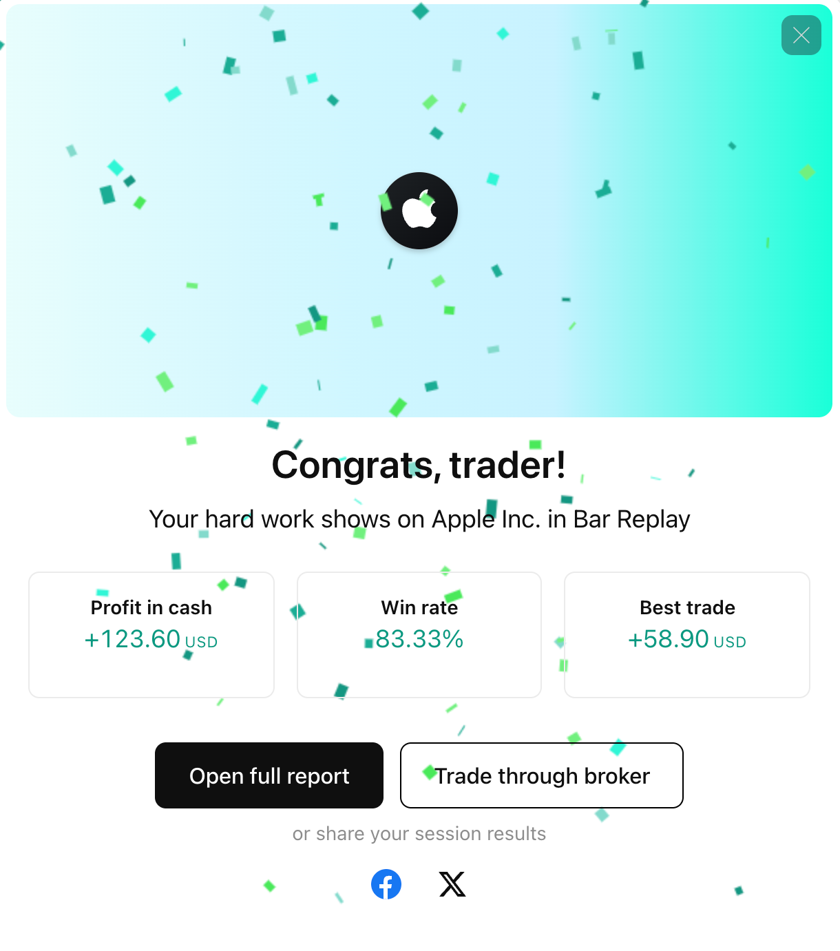 Após o final do replay, se pelo menos uma negociação for feita, um pop-up aparece com os resultados da negociação nesta sessão. Nesta janela pop-up, você pode alternar para negociar com uma corretora real ou abrir um relatório completo da sua sessão do replay.
