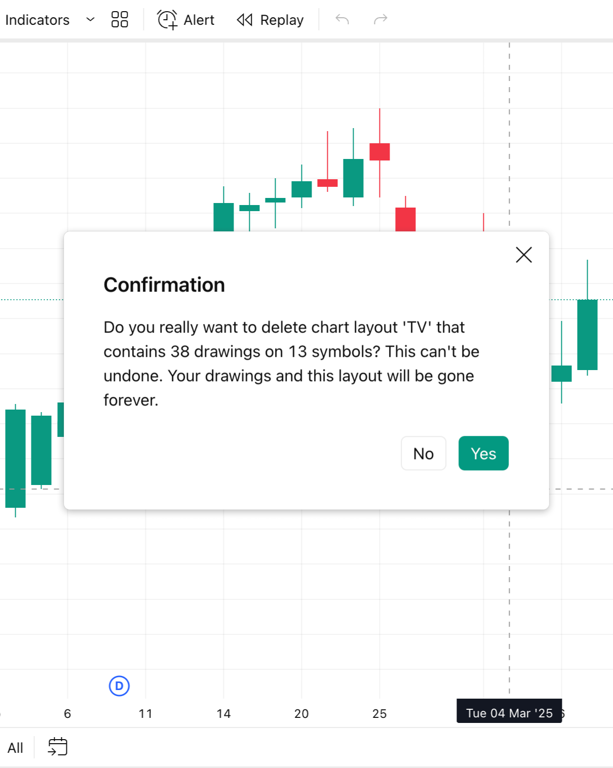 Se você aplicar acidentalmente um template de indicadores e remover objetos de desenho dos painéis de indicadores, clique imediatamente em “Cancelar”. Caso contrário, os objetos de desenho não poderão ser restaurados.