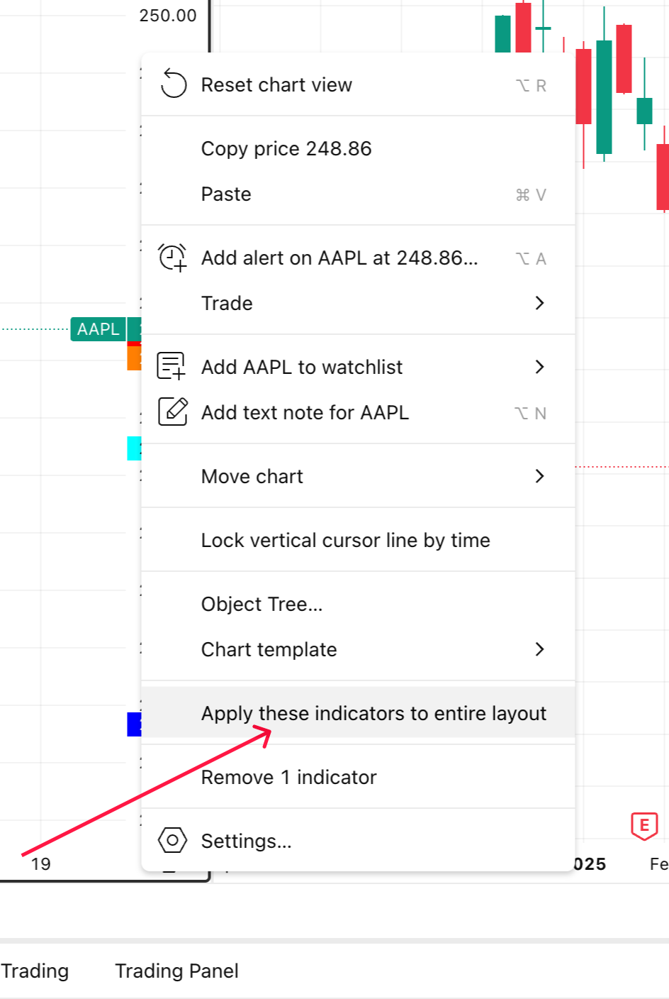 Ou, a partir do menu de contexto do gráfico, você pode aplicar todos os indicadores do gráfico atual a todos os outros clicando em Aplicar esses indicadores a todo o layout.