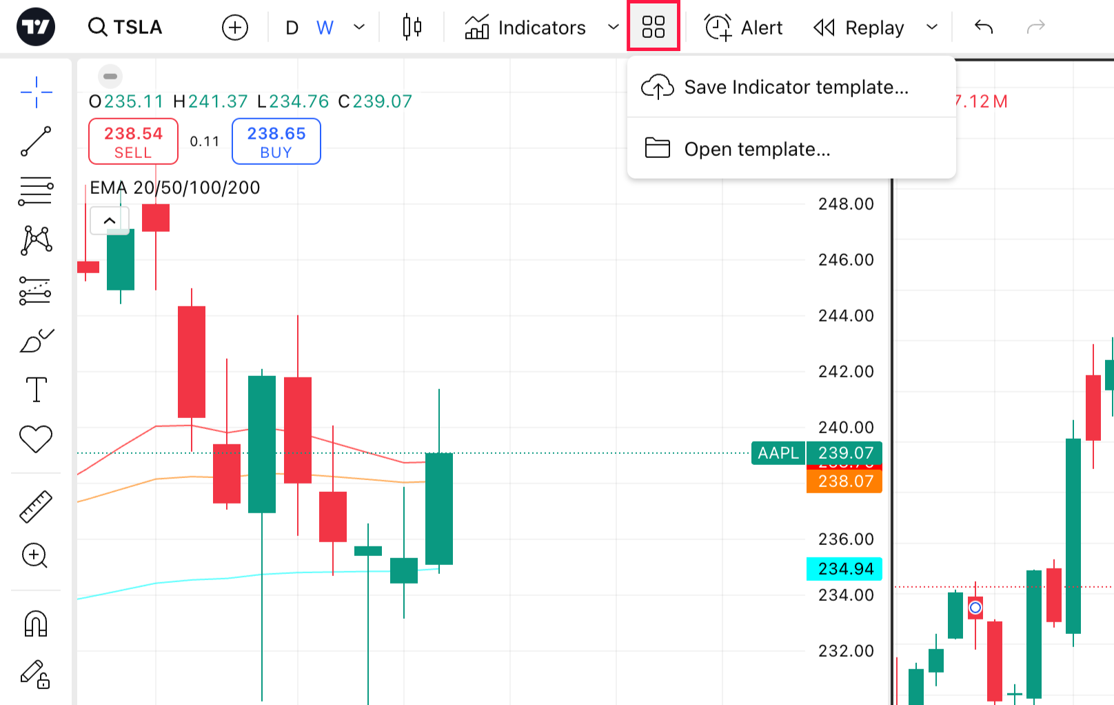 Ao aplicar um template, os indicadores atuais na série e nos painéis adicionais de indicadores serão removidos do gráfico, e os indicadores do template serão adicionados.