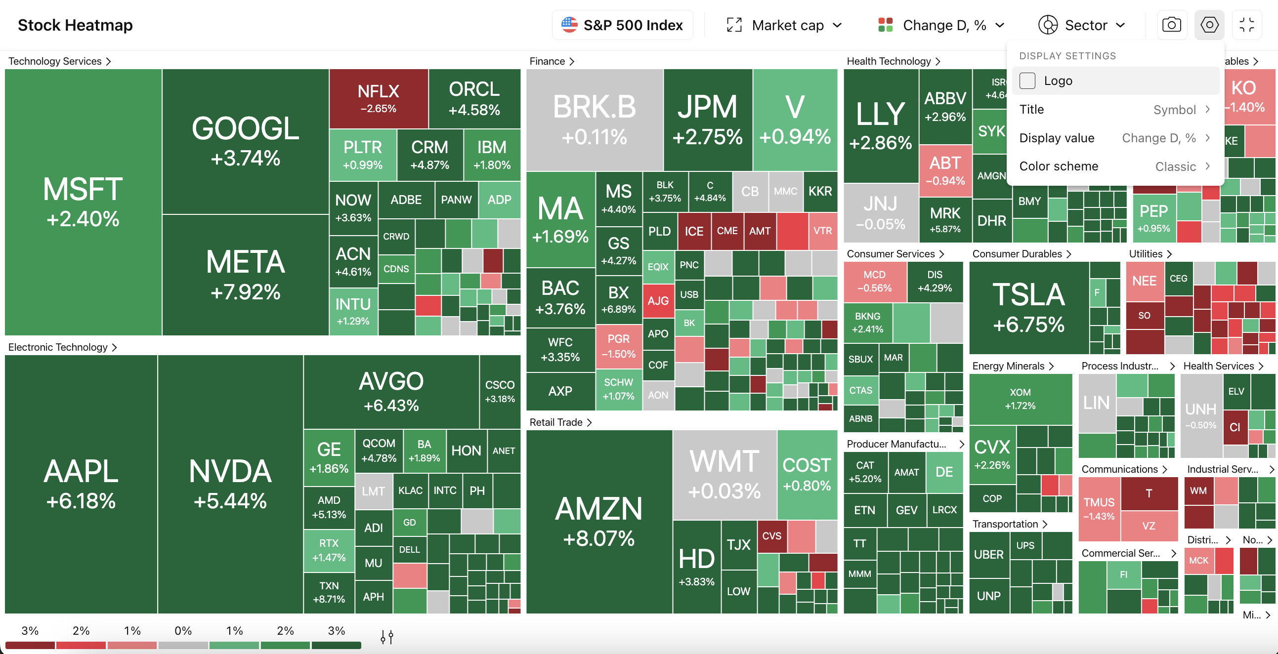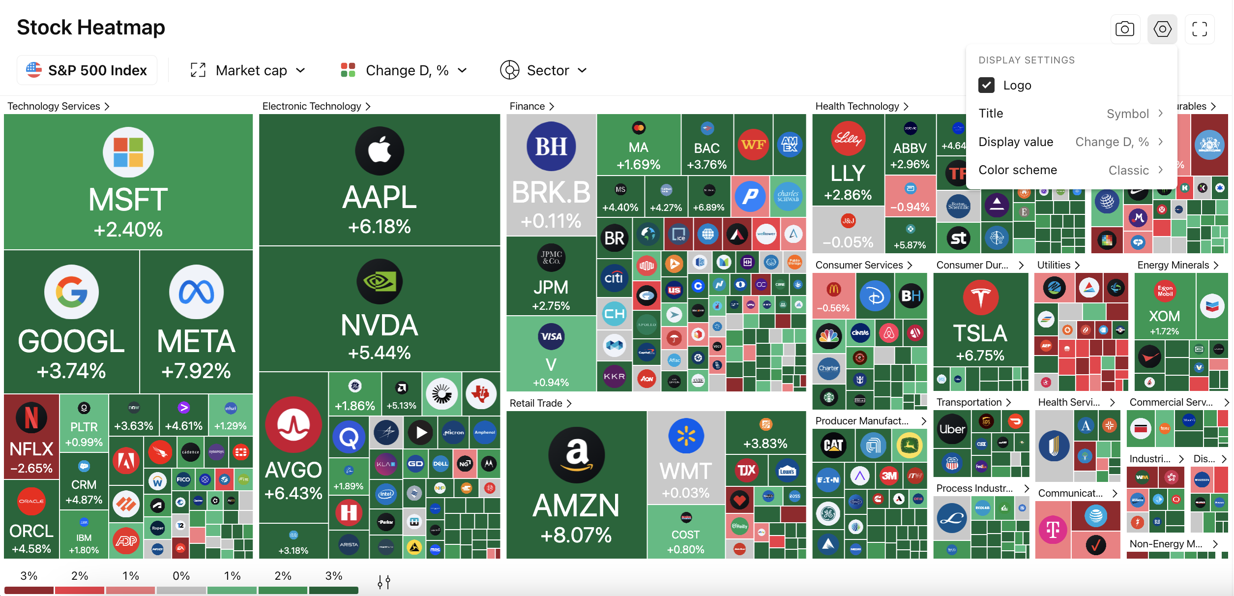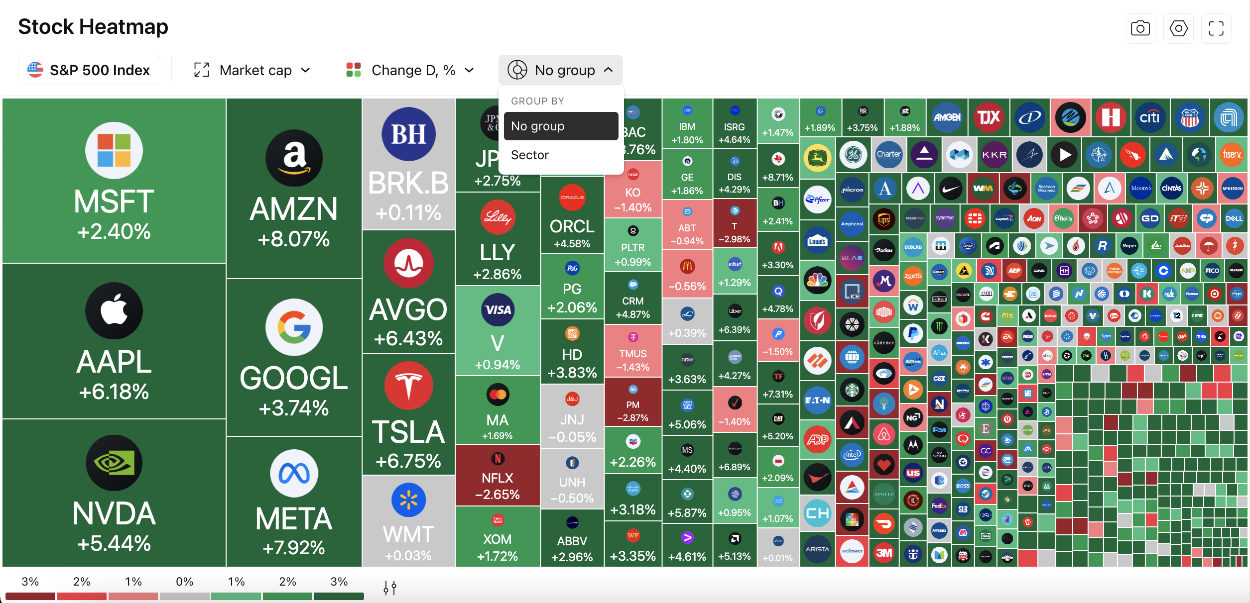 Há uma configuração de agrupamento no Mapa de Calor de ações: ao selecionar o modo Sem grupo, os símbolos do mapa de calor não são agrupados por setores.