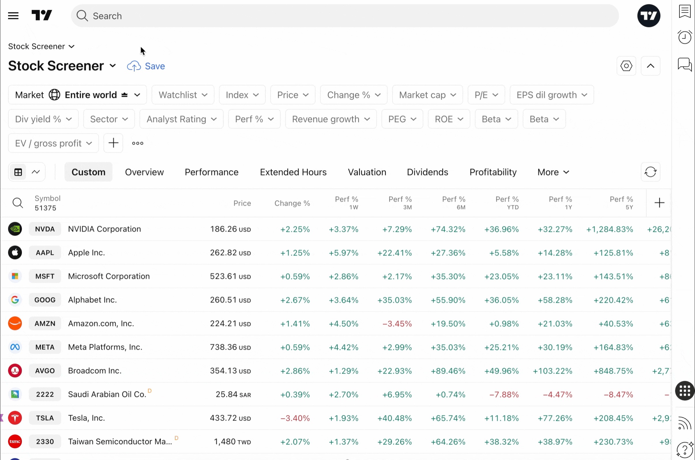 Os rastreadores funcionam como pontos de partida para a negociação, permitindo filtrar milhares de ativos de acordo com sua estratégia. Depois de configurar seus filtros e receber uma lista selecionada de símbolos, você pode transferir esses resultados para sua lista de observação para análise adicional e usar toda a gama de ferramentas analíticas do TradingView.