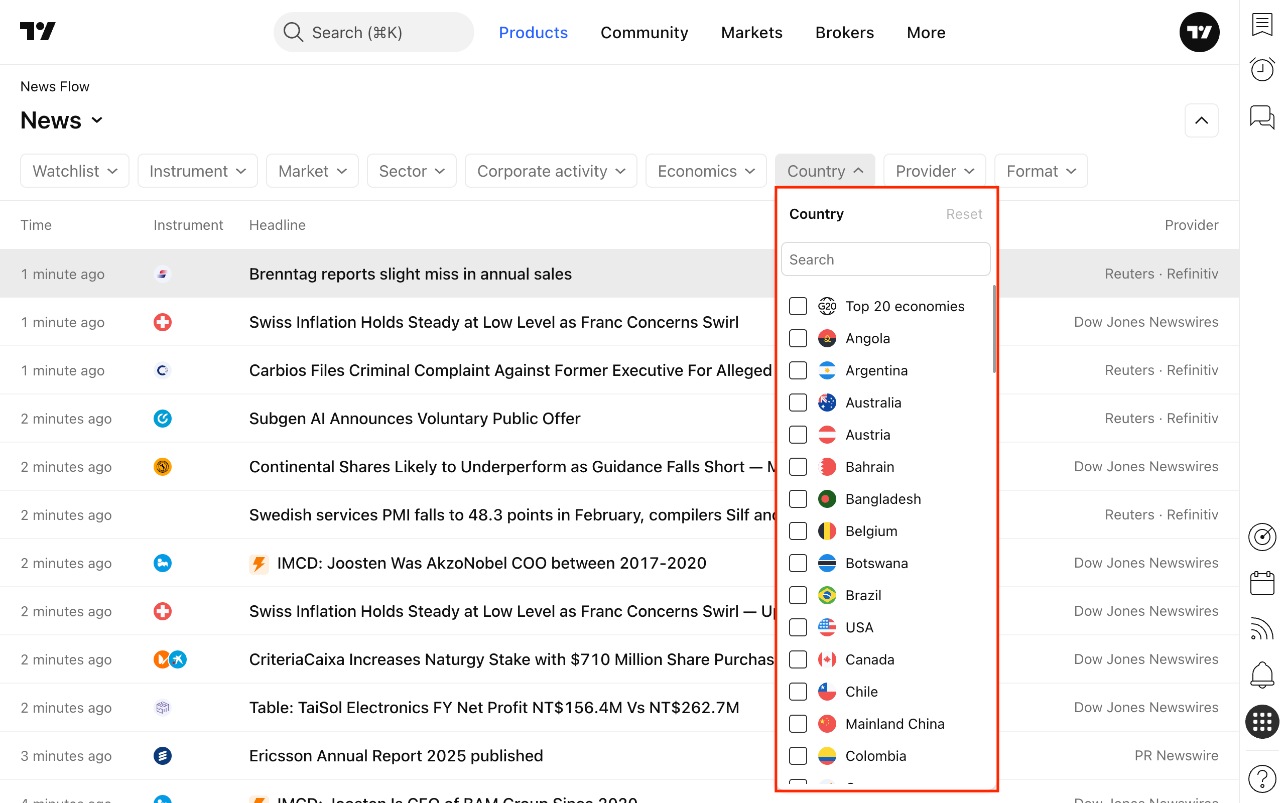 O filtro contém uma lista de países e grupos de países para os quais há notícias disponíveis. Você pode selecionar um ou vários valores de filtro.