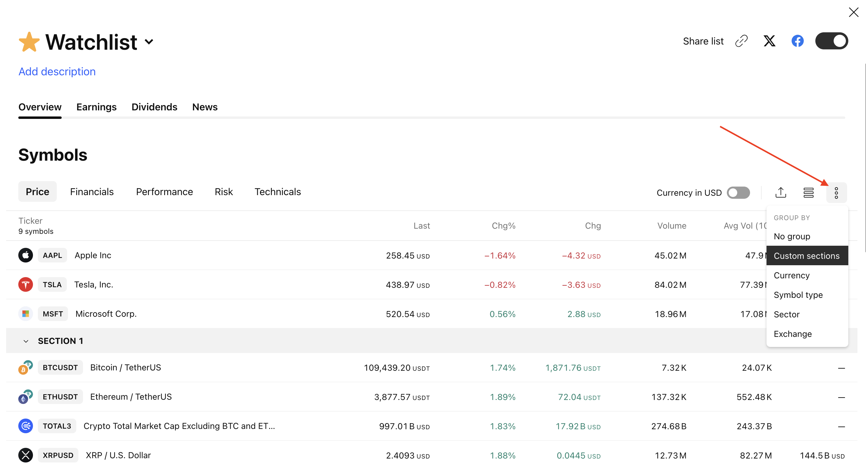 Você pode agrupar sua lista de observação por moeda, tipo de símbolo, setor ou bolsa.
