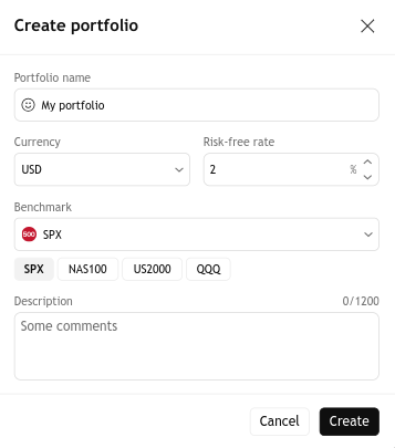 - Moeda— moeda do portfólio. Todos os valores de ativos serão automaticamente convertidos para essa moeda se forem negociados em outra. Os ativos de caixa também são contabilizados na moeda do portfólio.