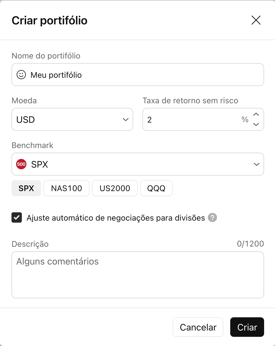- Benchmark— benchmark de performance de mercado. Permite que você compare o desempenho de seu portfólio com uma referência de mercado. Recomendamos usar como benchmark um índice ou um fundo correspondente ao mercado, ou setor da sua carteira. Saiba mais no artigo relacionado.