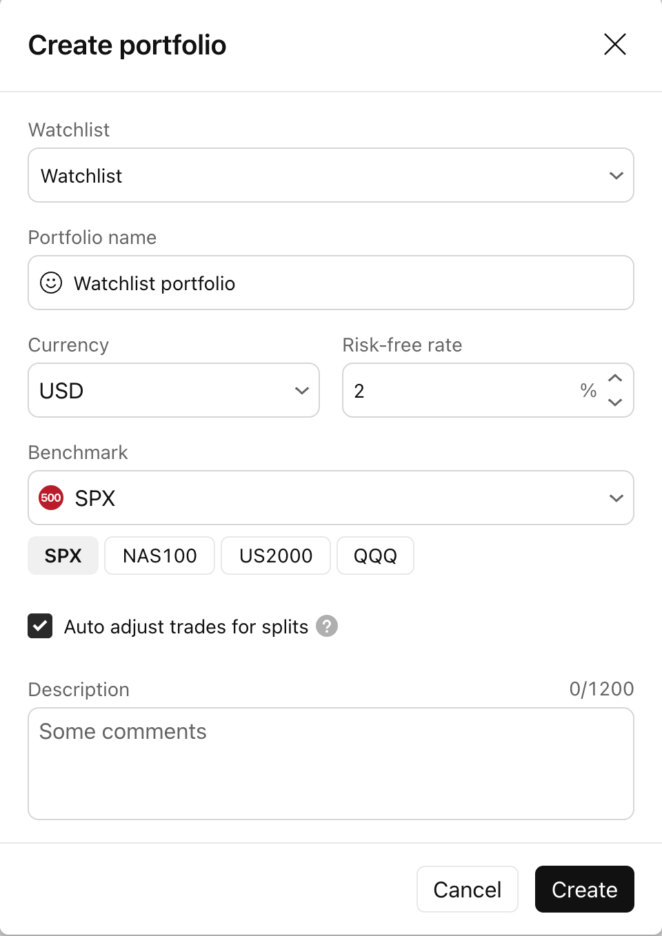- Lista de Observação — o nome da lista de observação a partir da qual o portfólio será criado. Por padrão, a última lista de observação ativa é selecionada.