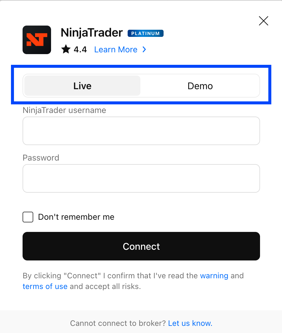 Recebo a mensagem de erro “Você não tem acesso a contas Live/Demo” na NinjaTrader