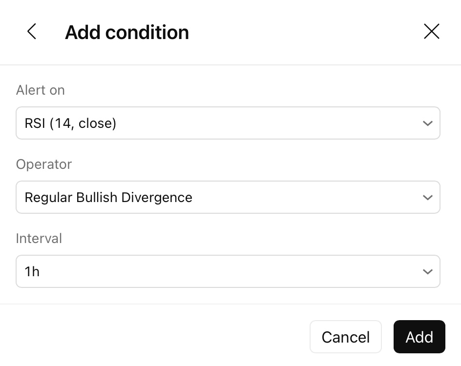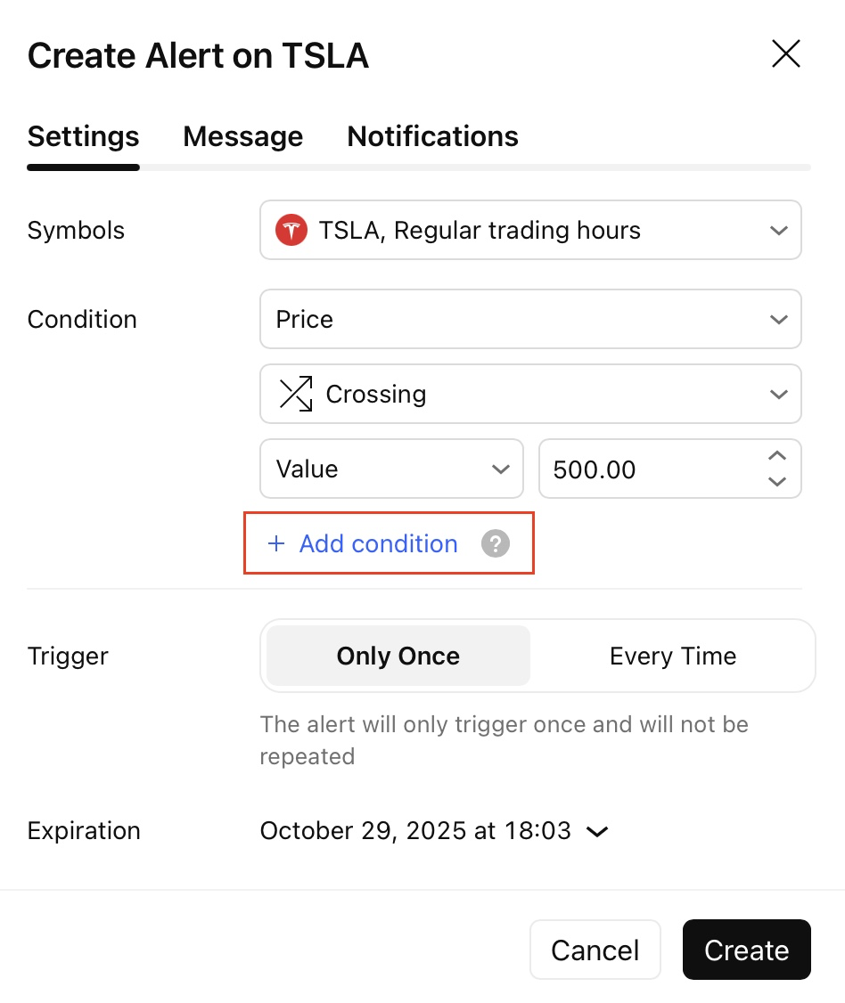 Crie alertas que verificam múltiplas condições de uma só vez — sinais mais inteligentes e precisos sem precisar escrever uma única linha de código. Com este recurso, você pode combinar até cinco condições diferentes — incluindo preço, desenhos e indicadores — em um único e poderoso alerta. O alerta será acionado somente quando todas as condições forem atendidas simultaneamente.