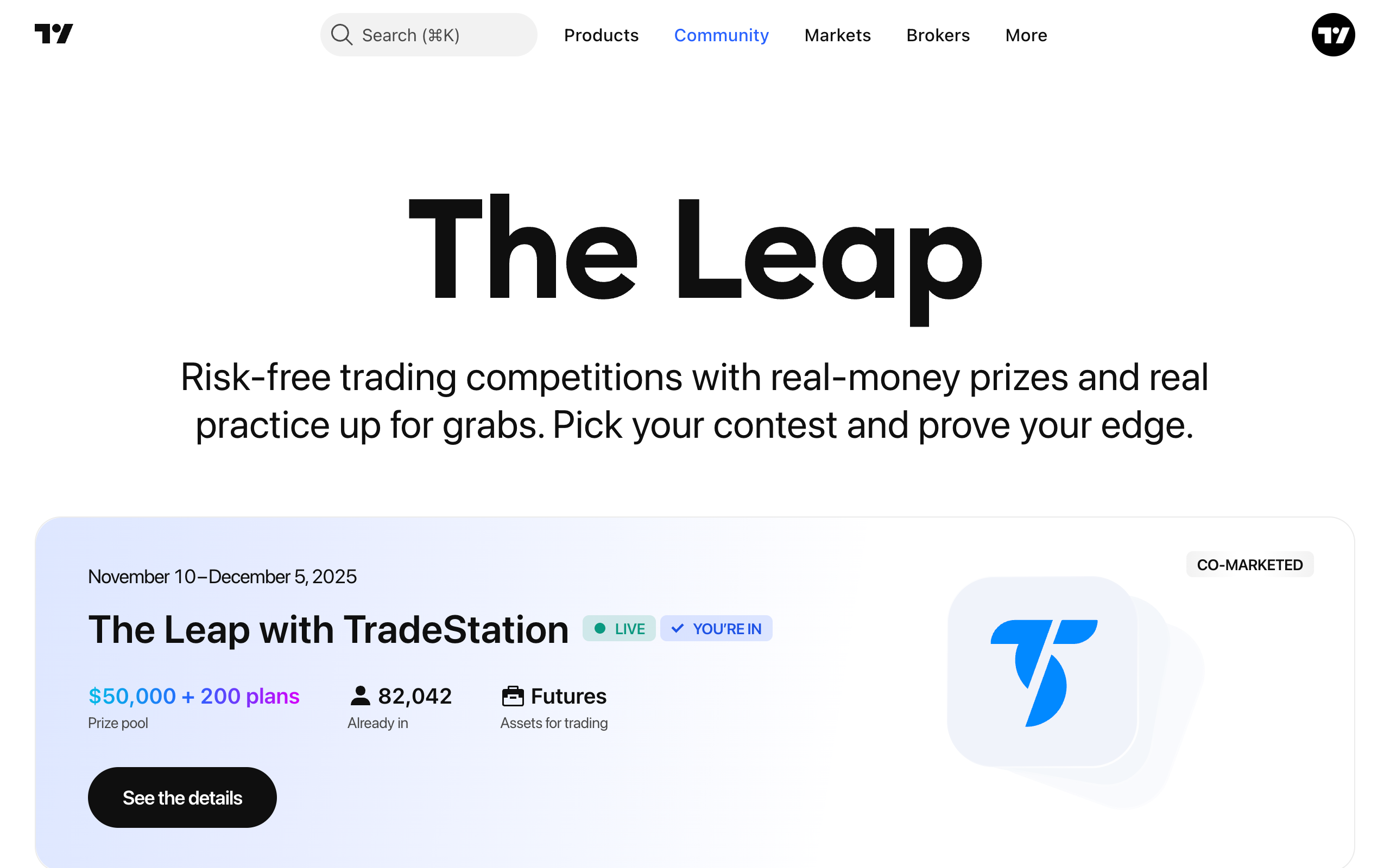 Cada edição do The Leap ocorre por um período definido, geralmente cerca de um mês. As inscrições abrem antes do início das negociações. Durante esse tempo, você pode participar por meio da sua conta do TradingView.