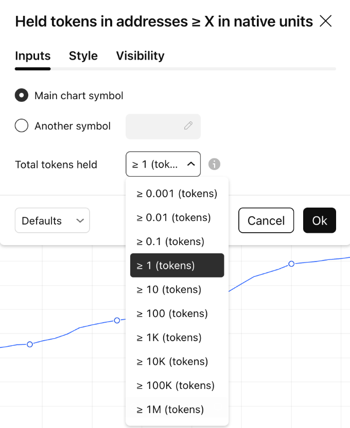 Tokens mantidos em endereços ≥ X (tokens) é calculado somando os saldos de endereços onde o saldo ≥ X unidades nativas. Os usuários podem ajustar o parâmetro X nas configurações do indicador para analisar a distribuição da oferta em diferentes categorias de tamanho do detentor.