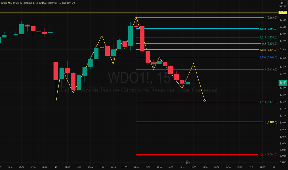 No gráfico de 5 minutos do DOL1!, rompeu o topo de um pivô de alta indicando a busca do(s) alvo(s) da projeção de Fibonacci, poderá acontece