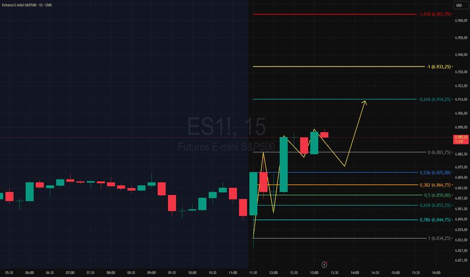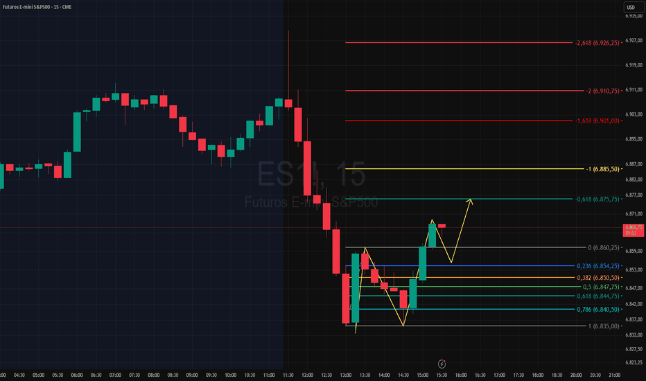 No gráfico de 15 minutos da ES1!, rompeu o fundo de uma última perna de alta indicando a busca do(s) alvo(s) da projeção de Fibonacci, poder