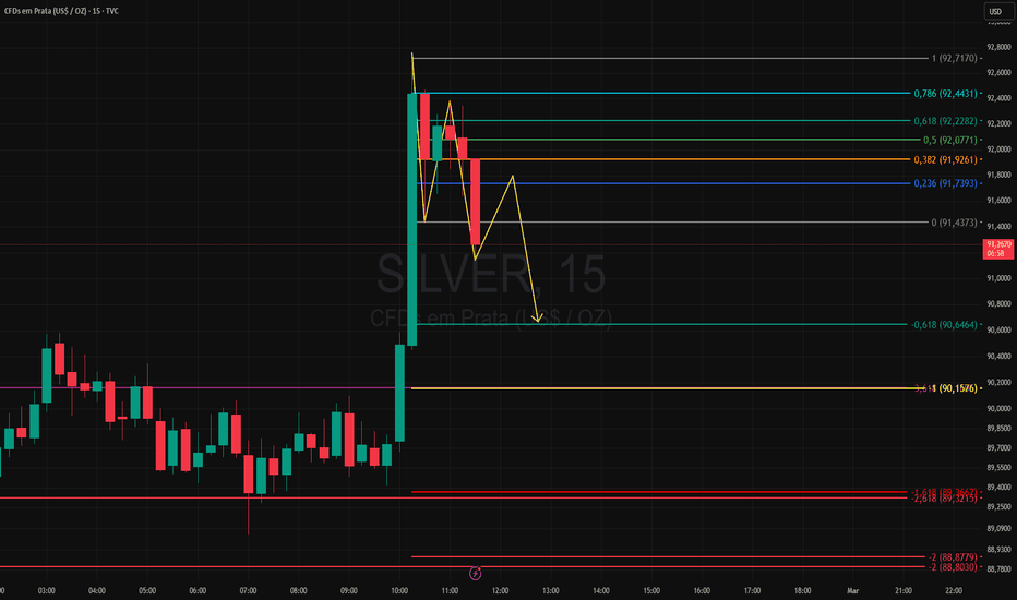 No gráfico de 5 minutos do SILVER, rompeu o topo de uma última perna de baixa indicando a busca do(s) alvo(s) da projeção de Fibonacci, poderá acontecer uma retração antes que chegue ao pri